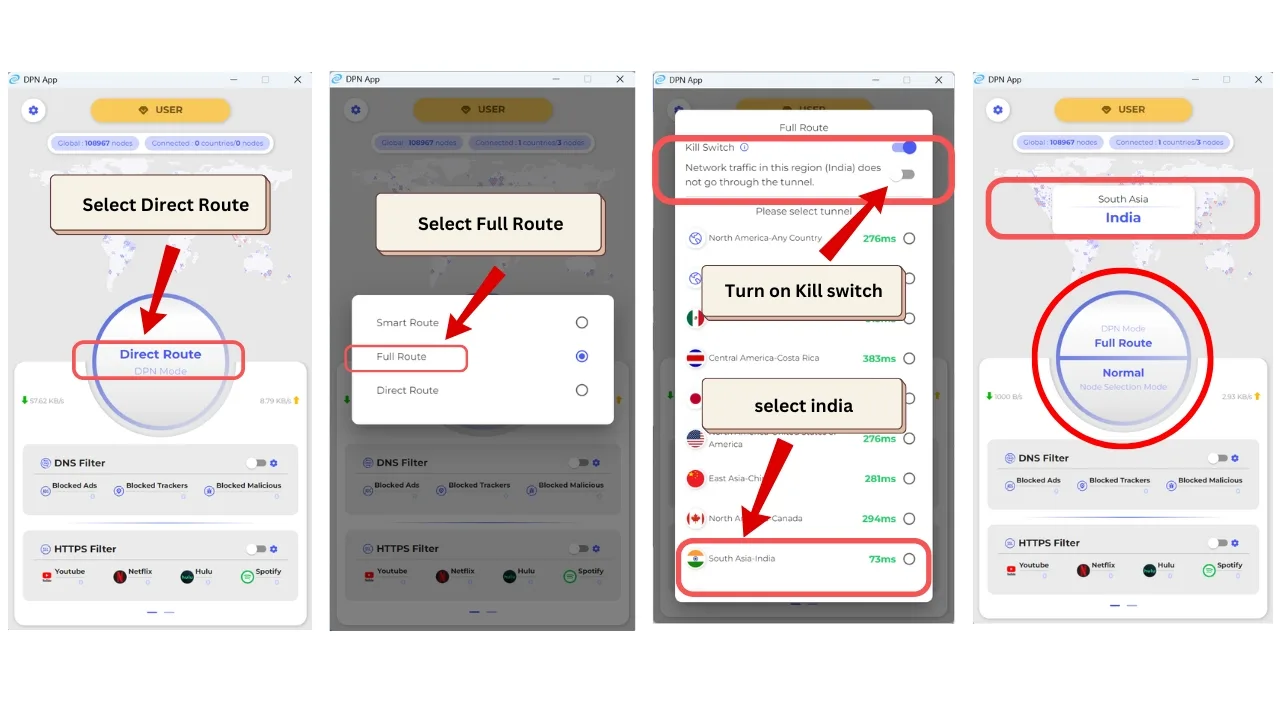 - Full Route Connection: This option offers complete protection by routing all traffic through an Indian server, ensuring there is no chance of IP leakage.
